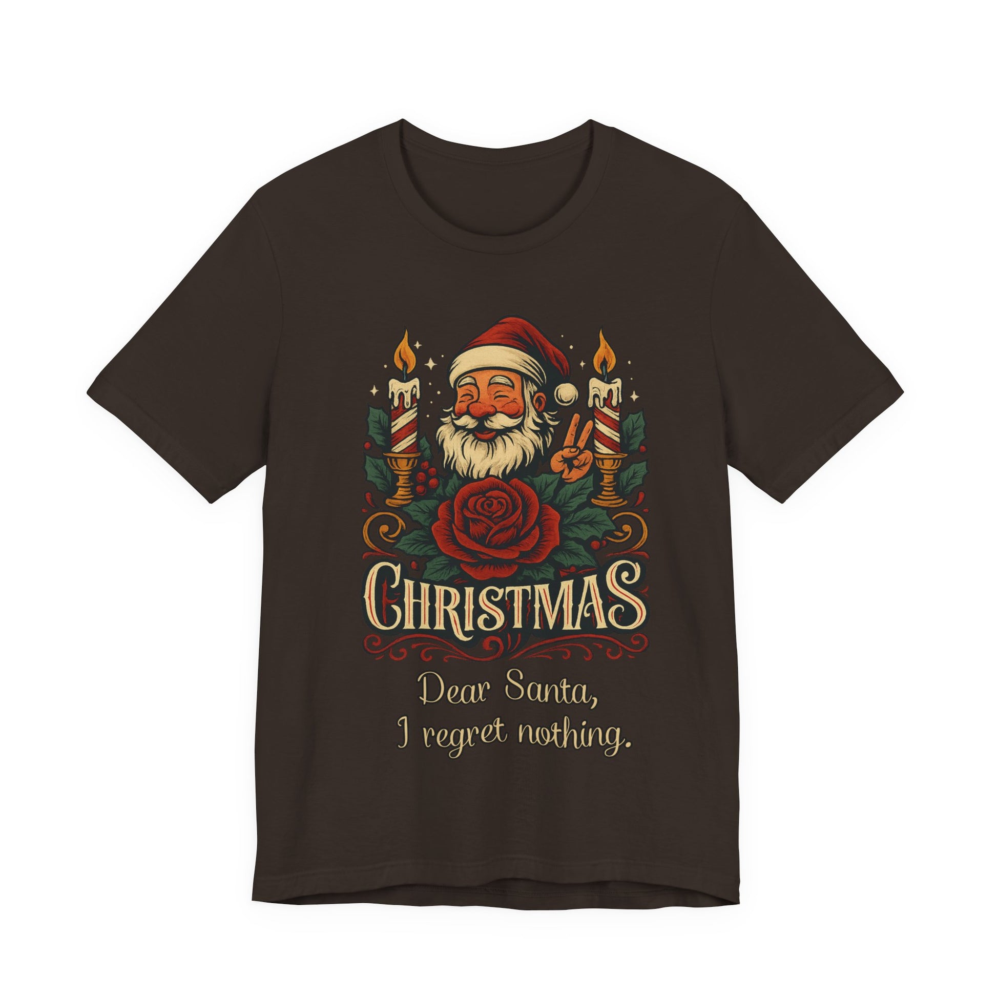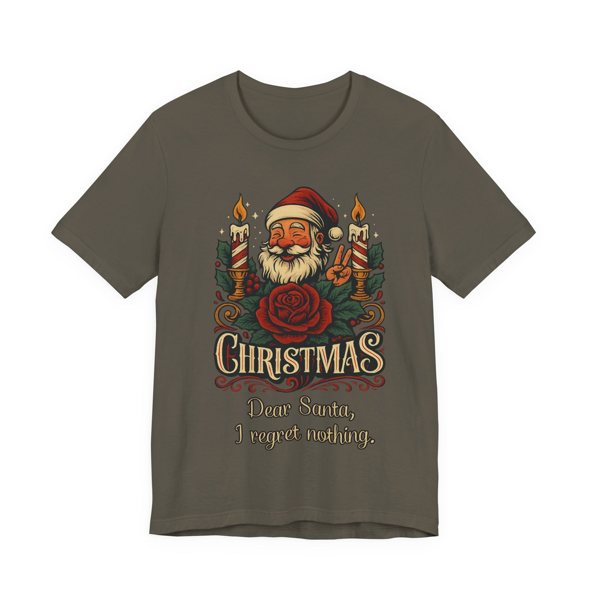 A funny and classic vintage Christmas themed unisex t-shirt short sleeve tee with a 'Dear Santa, I regret nothing' design. Perfect for those who enjoy humor and want to embrace the holiday spirit without any regrets. Ideal for adults looking for a casual and comfortable shirt for the holiday season.